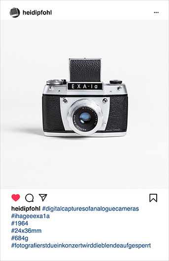 Das Projekt findet sich seit August 2019 auf Instagram unter dem Hashtag #digitalcapturesofanaloguecameras und dem Profil @heidipfohl. Es wird jeden Dienstag um eine Kamera erweitert.