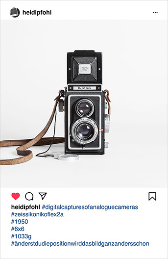 #digitalcapturesofanaloguecameras zeigt analoge Kameras, digital fotografiert, auf Instagram. Analoge Kameras erhalten hier wöchentlich eine Bühne ihrer eigenen Repräsentation, zeigen sich als sachlich portraitierte Objekte, die dem Prinzip der Frontalität folgen. Die jeweiligen Hashtags geben dabei akribisch genau recherchierte