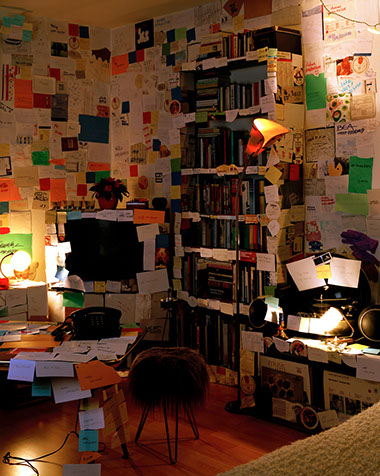 Der in der Fotografie dargestellte Raum ist bewohnt, hierdurch zeigt sich der Aspekt des Eingriffs in die Privatsphäre von social networks, ein Bezug zum Datenschutz wird hergestellt. Ebenso die Komponente des zeitlichen Verpassens kommt hier zum Ausdruck, da im Raum außer den Zetteln nur analoge Medien zu sehen sind (Bücher, VHS-Kassetten, altes Telefon, Schallplattenspieler, etc.).