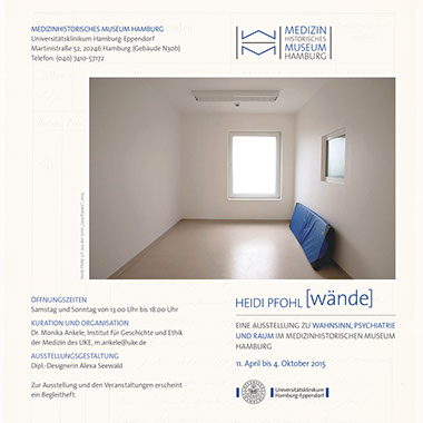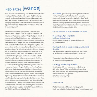 Diesen und anderen Fragen geht die Künstlerin Heidi Pfohl in ihren Arbeiten nach: Ihr Objektiv richtet sie auf Räume der Psychiatrie, zeigt die Vielgestaltigkeit derselben und verweist auf die historischen und mythologischen Ursprünge, die spezifische Umgangsformen mit psychisch Kranken bis heute prägen und sich in den Raum einschreiben. Ein zentraler Moment ihrer Fotografien liegt auf der Ambivalenz von Innen und Außen und welchen räumlichen Ausdruck dieses Verhältnis jeweils findet: Seien es Fenster, die nicht geöffnet werden können, ein Garten, der nicht wirklich ins Freie führt, eine Glasscheibe, die den Blick in nur eine Richtung freigibt. Stehen im Fokus der Arbeit Lieu/Espace (2013) die Patientenzimmer sowie die Krisen und Ruheräume von Kinder- und Jugendpsychiatrien, so ist es in dem Werkkomplex Unter den hohen Bäumen (Enquête Psychiatrie) (2014) mit dem belgischen Ort Geel und seinem System der psychiatrischen Familienpflege eine ganze Stadt, die den psychiatrischen Raum rahmt. Pfohls Bildsprache ist klar und nüchtern, die Perspektive ihrer Kamera (vermeintlich) objektiv. Daraus erwächst jene Spannung, die den Bildern immanent ist und die ihren Ausdruck in dem Kontrast zwischen dem Sichtbaren und dem Nicht-Sichtbaren, dem Darstellbaren und dem Nicht-Darstellbaren findet. Diese Präsenz des Absenten konfrontiert den Betrachter schließlich mit seinen eigenen Vorstellungen und regt dazu an, über das Verhältnis von Wahnsinn, Psychiatrie und Raum nachzudenken. (Dr. Monika Ankele)