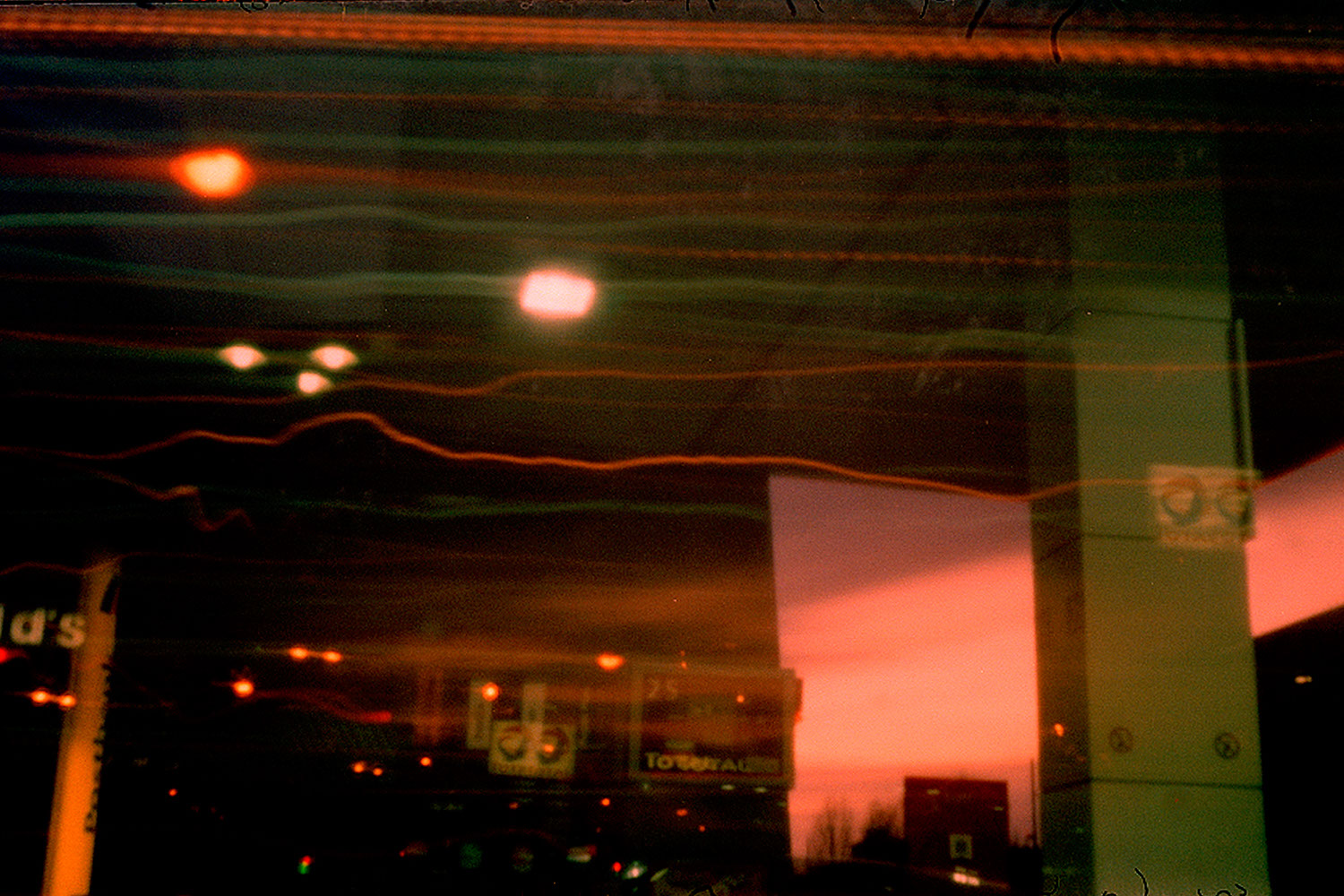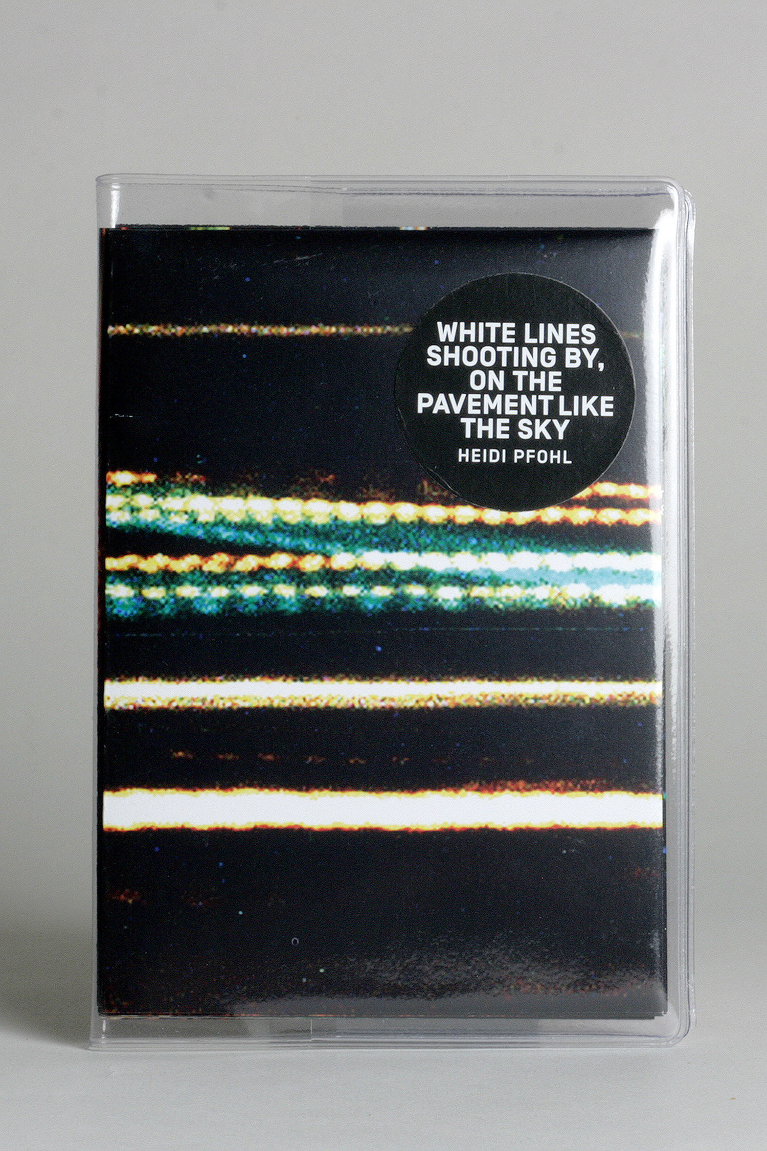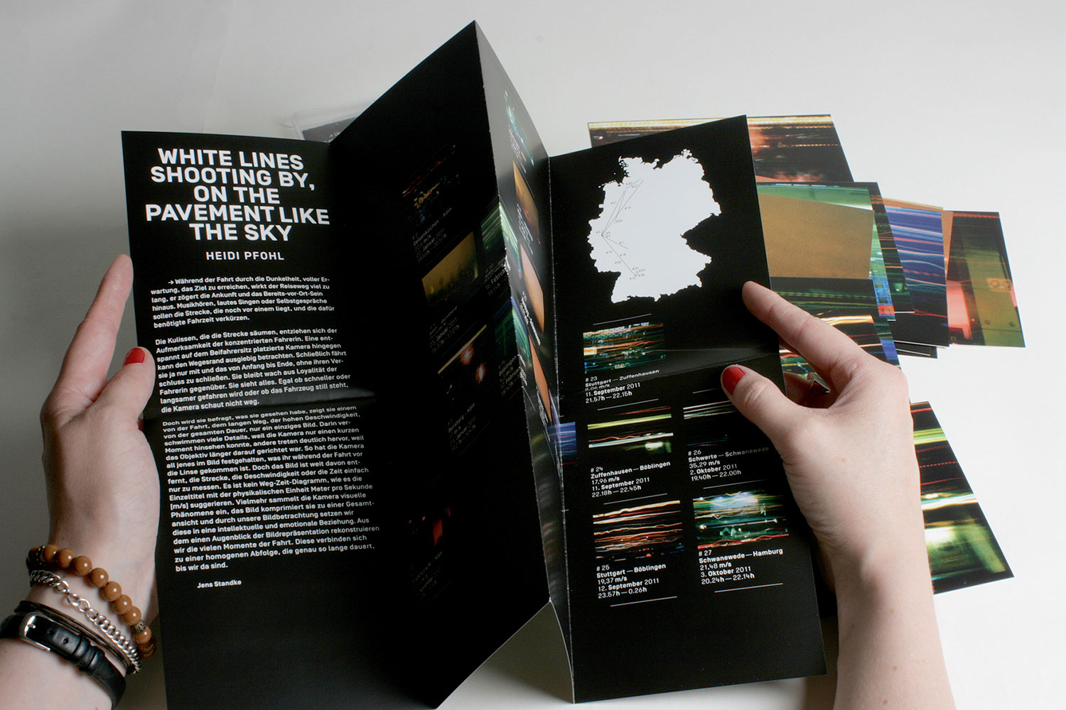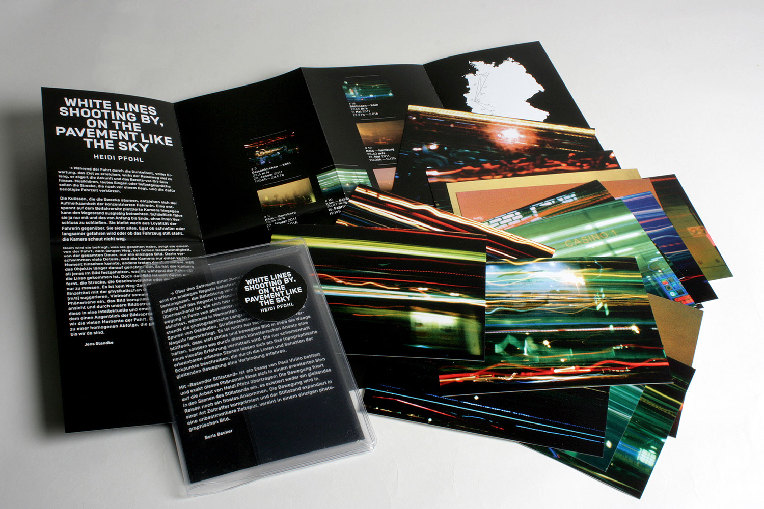 Bei der Arbeit „ White lines shooting by, on the pavement like the sky“ handelt es sich um ein Experiment von Moment- oder Zufallsfotografie. Jede Fahrt, die mit dem Auto zurückgelegt wird, wird in einer Aufnahme, deren Belichtung die Länge der zurückgelegten Strecke hat, aufgenommen. Dadurch ergeben sich Langzeitbelichtungen, die einem Zufallsprinzip folgen. Sie erfassen das Transitorische und stellen im Bild auf Dauer, was während der Fahrt vorhanden war, aber nicht unbedingt wahrgenommen wurde. Interessant ist am Ergebnis, dass das nicht Wahrgenommene bzw. Aufgenommene auf einem einzelnen Negativ komprimiert ist. Es überlagern sich verschiedene Umgebungen und durch die unterschiedliche Schnelligkeit des bewegten Fahrzeuges (z.B. Ampel, Stau, Überholen anderer Fahrzeuge, etc.) treten manche Dinge durch die Fotografie mehr oder weniger hervor bzw. ins Bewusstsein. Die Information der Umgebung wird im Vorbeifahren auf ein Negativ reduziert, welches das Gesehene kompakt beinhaltet und manches mehr oder weniger zum Vorschein bringt.
