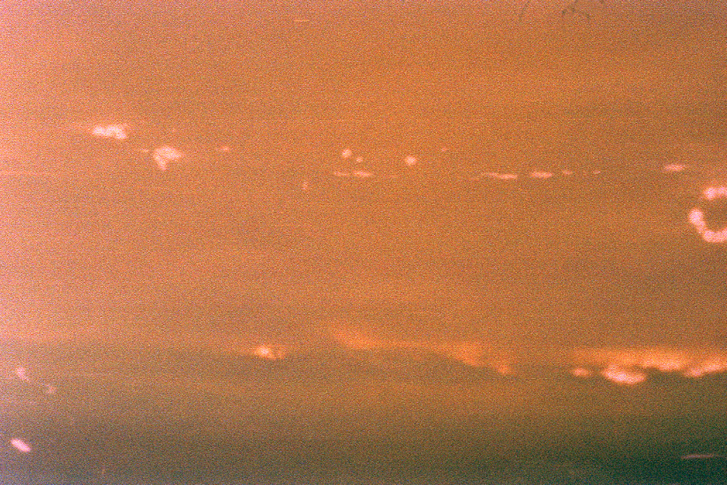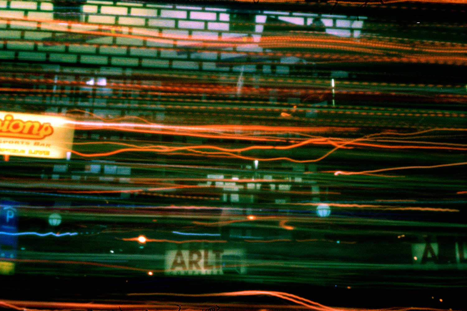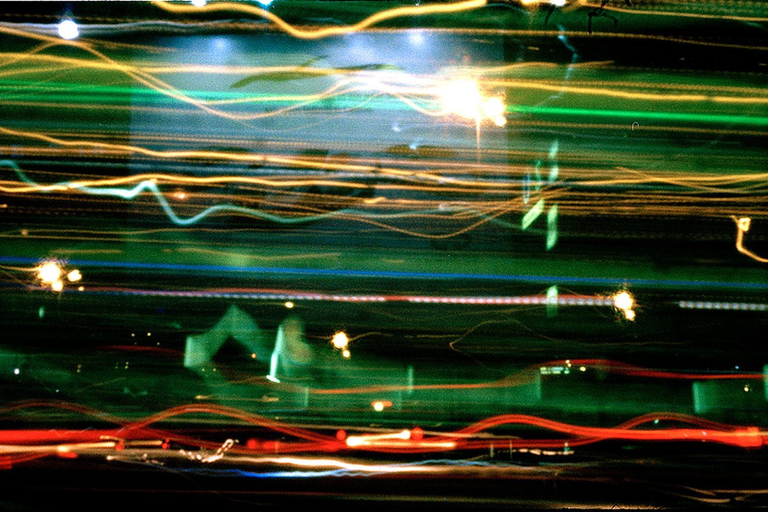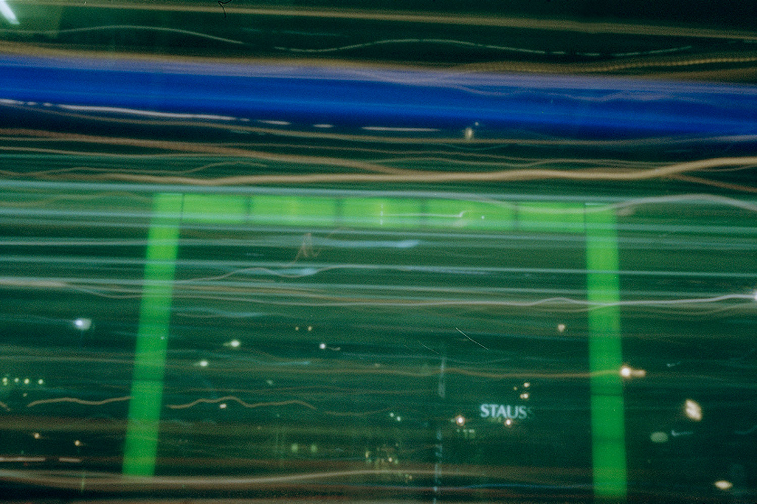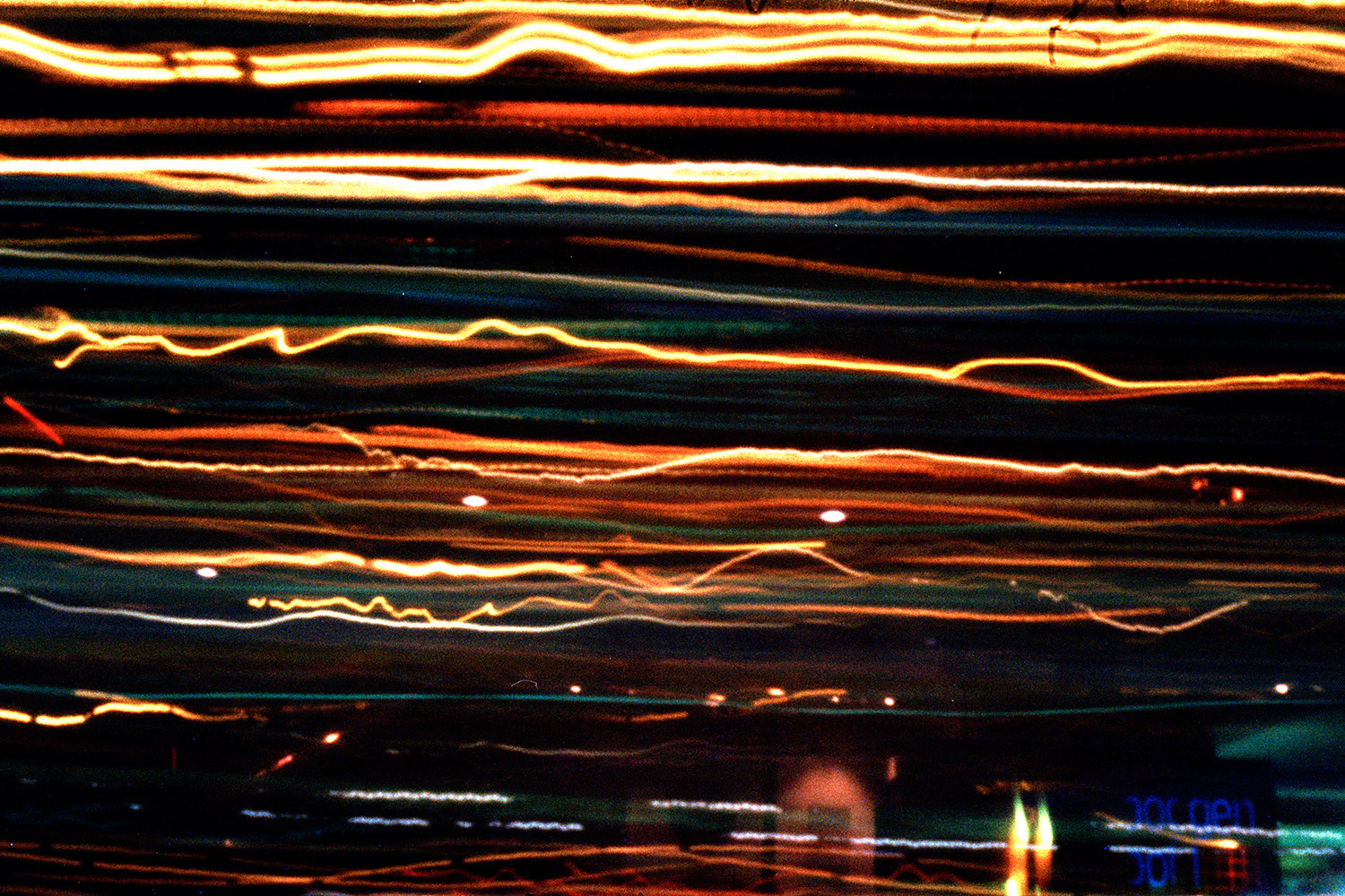 Bei der Arbeit „ White lines shooting by, on the pavement like the sky“ handelt es sich um ein Experiment von Moment- oder Zufallsfotografie. Jede Fahrt, die mit dem Auto zurückgelegt wird, wird in einer Aufnahme, deren Belichtung die Länge der zurückgelegten Strecke hat, aufgenommen. Dadurch ergeben sich Langzeitbelichtungen, die einem Zufallsprinzip folgen. Sie erfassen das Transitorische und stellen im Bild auf Dauer, was während der Fahrt vorhanden war, aber nicht unbedingt wahrgenommen wurde. Interessant ist am Ergebnis, dass das nicht Wahrgenommene bzw. Aufgenommene auf einem einzelnen Negativ komprimiert ist. Es überlagern sich verschiedene Umgebungen und durch die unterschiedliche Schnelligkeit des bewegten Fahrzeuges (z.B. Ampel, Stau, Überholen anderer Fahrzeuge, etc.) treten manche Dinge durch die Fotografie mehr oder weniger hervor bzw. ins Bewusstsein. Die Information der Umgebung wird im Vorbeifahren auf ein Negativ reduziert, welches das Gesehene kompakt beinhaltet und manches mehr oder weniger zum Vorschein bringt.